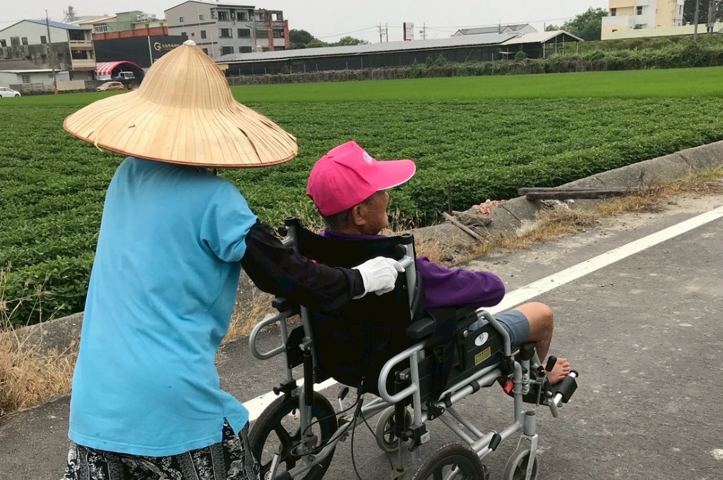 瓊伶睡在父親隔壁,比父親晚睡、比父親早起,家中父親會經過的區域都裝上扶手,父親的身體與房間永遠乾淨、清新,毫無異味。白天她推著輪椅上的父親在鄉間小路散步,聽父親如數家珍地介紹農作,晚上父親睡著後,自己才到田裡務農。