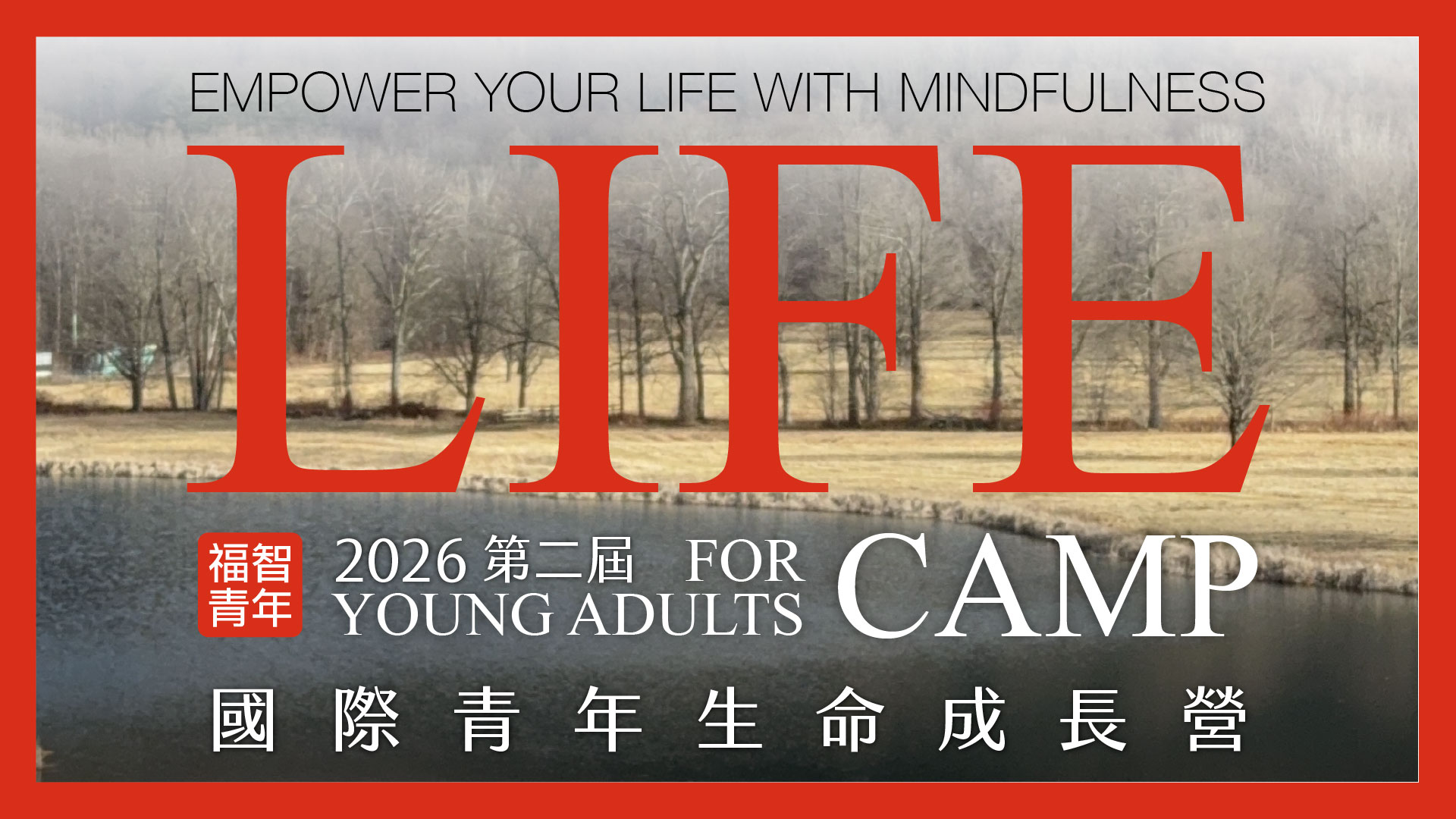 Empower Your Life with Mindfulness. 日期:JAN. 1-4, 2026 (THU.~SUN.) 地點:紐約禪修莊園 Honor's Haven Retreat & Conference(1195 Arrowhead Rd, Ellenville, NY 12428 USA) 對象:35歲以下青年(含大學在校生、研究生與社會青年) 內容:正向思維、觀功念恩、友善大地、靜心禪修 語言:中文/ English 報名:DEC. 15, 2025 報名截止 費用:早鳥特別優惠:USD $650/人(限NOV.30,2025前報名 原價USD$800) 兩人同行優惠價:USD $600/人 含全程食宿、活動、場地、教材、JFK機場接駁;機票自理 活動資訊+網路報名:http://bwyouth.org/2026nycamp 主辦單位:The Oneness Truth Foundation 協辦單位:福智文教基金會