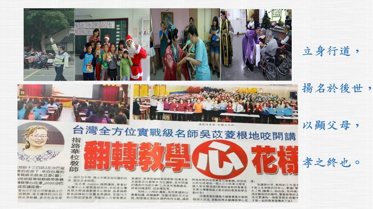 她將這些付出歸功於父母身教所薰習,也期許自己能一手自助,一手助人,以種種善行顯揚父母。