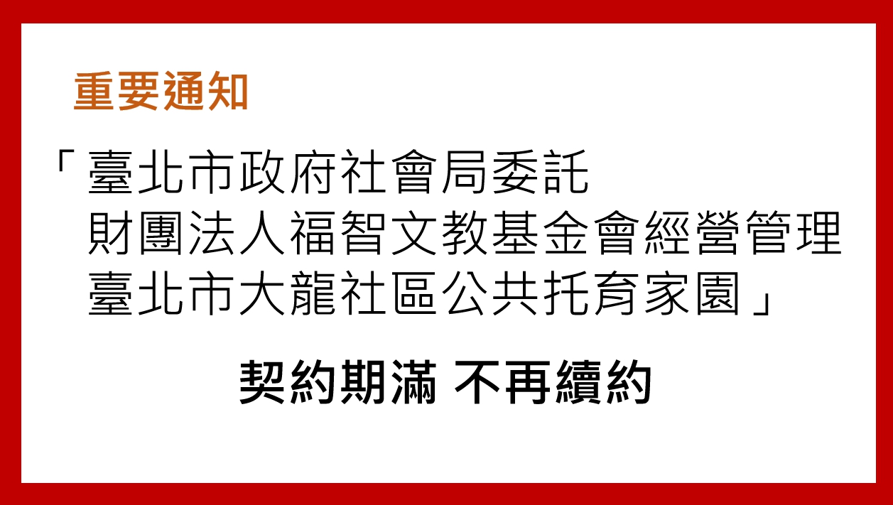 公告日期:2019/12/31 適用對象:所有大眾 內容: 「臺北市政府社會局委託財團法人福智文教基金會經營管理臺北市大龍社區公共托育家園」契約期間民國106年7月27日至108年12月31日止,契約期滿不續約,已在民國 108年7月8日經由臺北市政府社會局核准。新承接單位為「臺北市嬰幼兒托育協會」。 感謝您的支持。