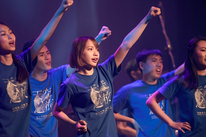 【台北訊】舞台上的畫面,是裝滿燃料的火箭升空,噴射出濃濃的火焰與白煙,將太空梭載離地球表面,探索浩瀚無垠的外太空,這是許多青年朋友心中的夢想。在「天空之旅--福智青年讚頌音樂會」,福青讚頌團將它結合於「燃燒吧!小宇宙」這首福青同學自創曲,用輕快的音樂律動,帶動全場高唱「讓我們找到生命目標往前衝,一起描繪幸福輪廓」鼓勵年輕人勇於尋找有意義的生命方向。